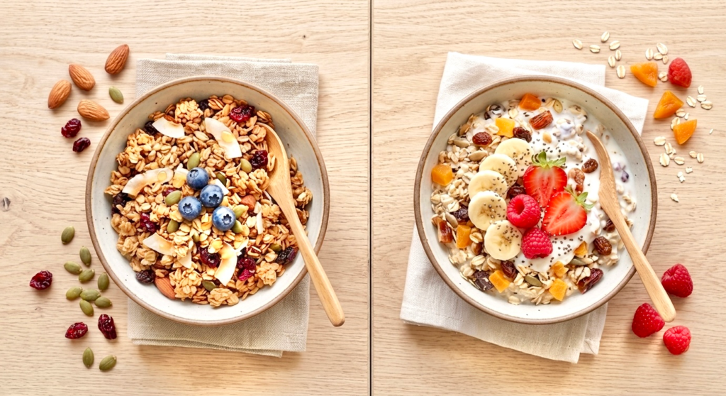 - Choose granola if you want something filling, flavourful, and satisfying. It’s ideal for active people, busy mornings, or anyone who needs a breakfast that keeps them going until lunch.