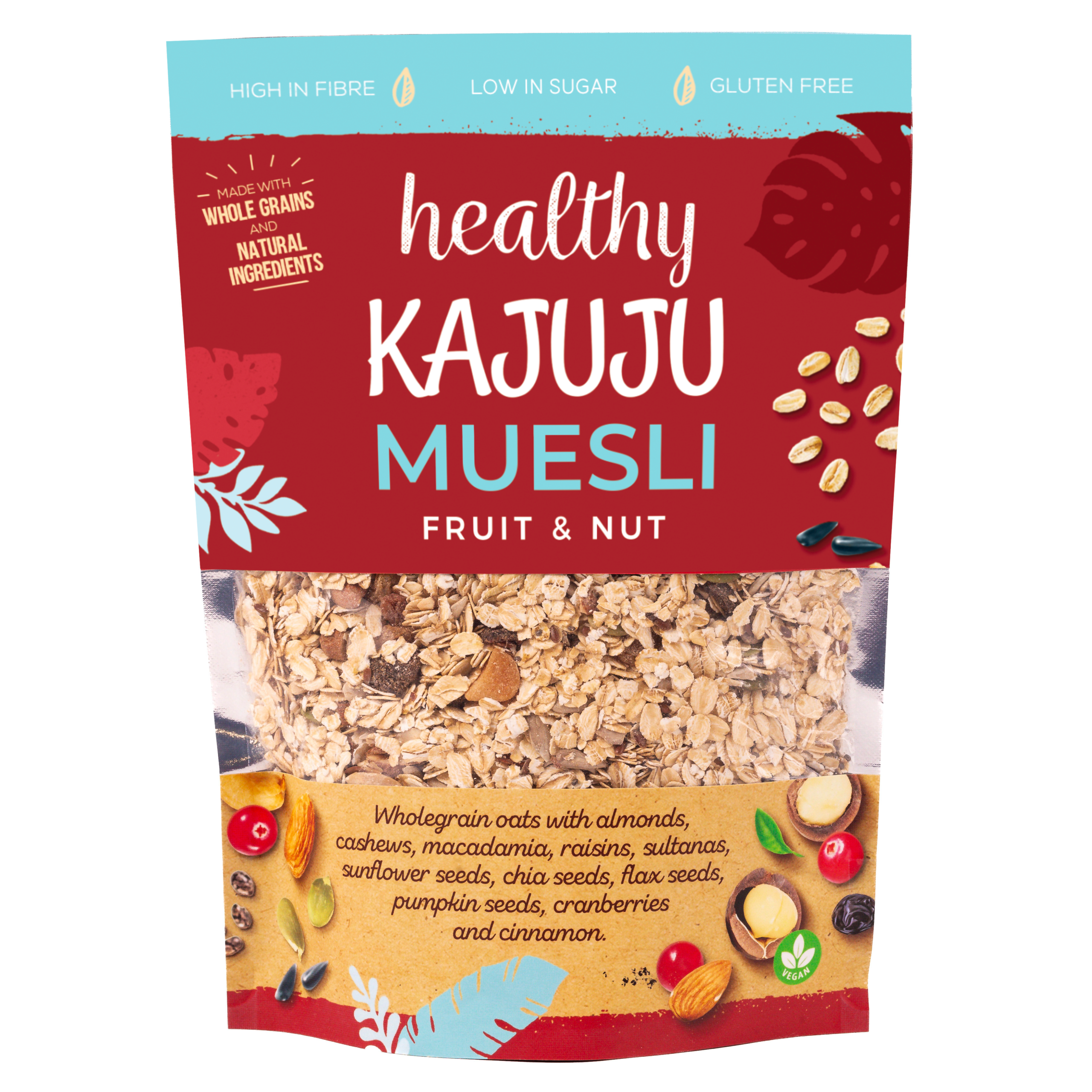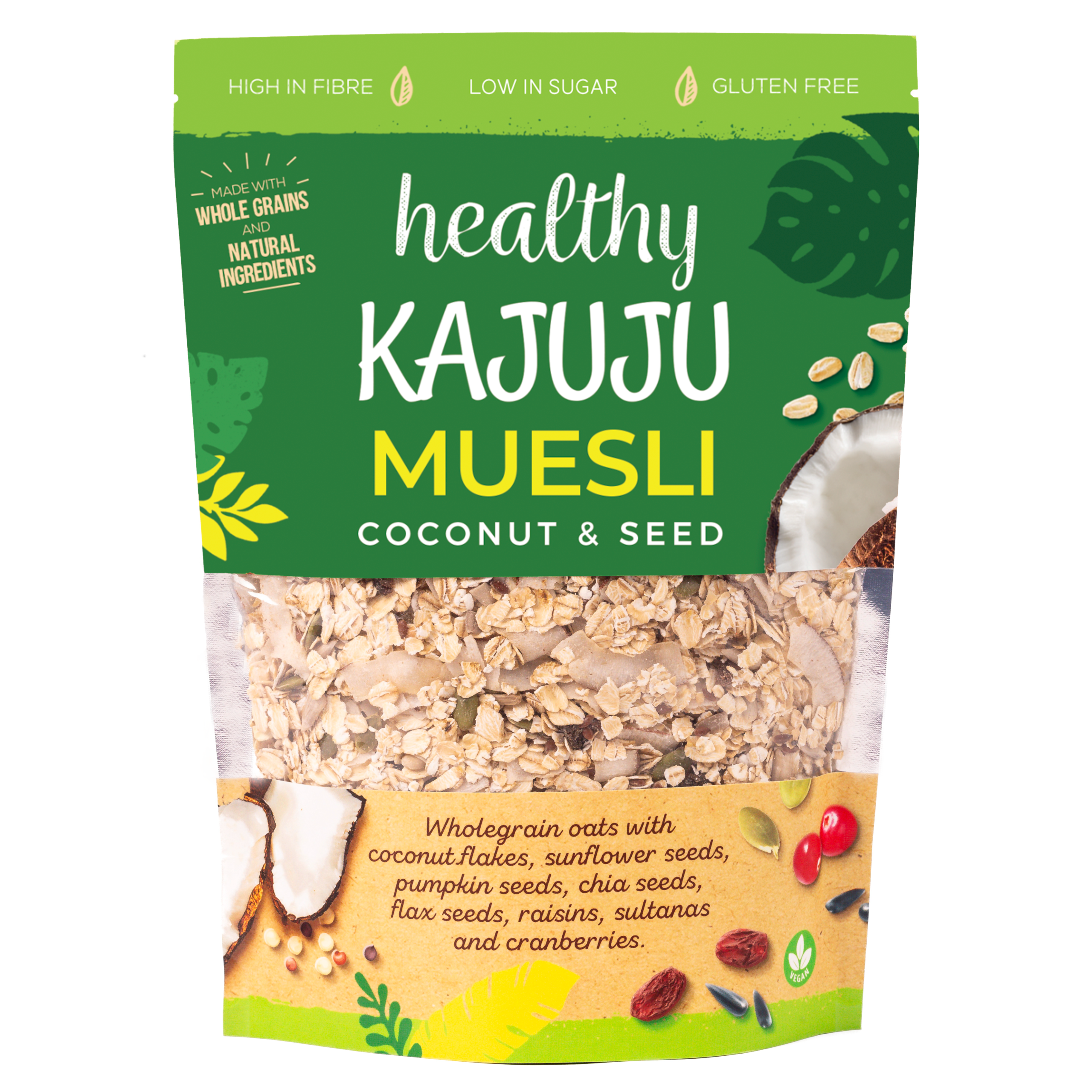 Oats, dried mango, dried pineapple, cashews, sunflower seeds, chia seeds, pumpkin seeds